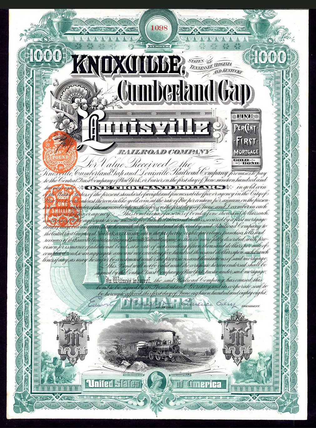 Knoxville, Cumberland Gap and Louisville Railroad Co. (TN, VA, KY), 5% Forst Mortgage Gold Bond for $1000, 1888, #1098, ornate heading and border incorporating cherubs and floral decorations, vignette of steam train at bottom, green and black, printed by Homer Lee Bank Note Co., two red British revenue stamps, with coupons, uncancelled, AEF.