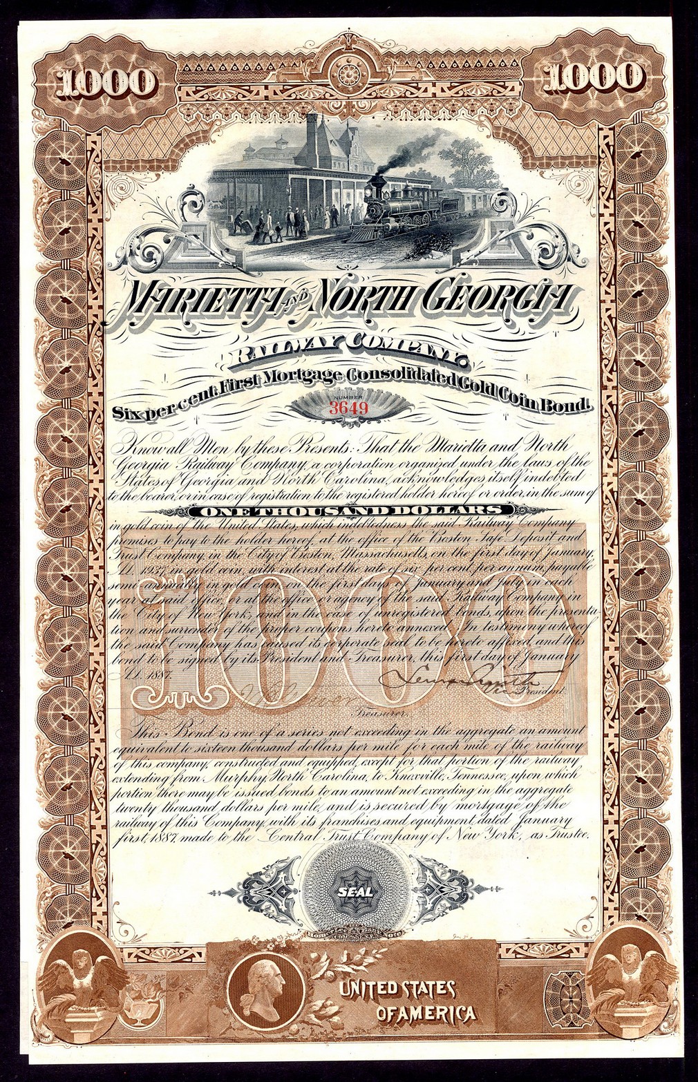 Marietta and North Georgia Railway Co. (GA, NC), 6% First Mortgage Consolidated Gold Bond of $1000, 1887, #3649, lovely vignette at top of steam train pulling in to station with passengers waiting, ornate border with American eagle at bottom, brown and black, printed by Homer Lee Bank Note Co., with coupons, unancelled, AEF.
