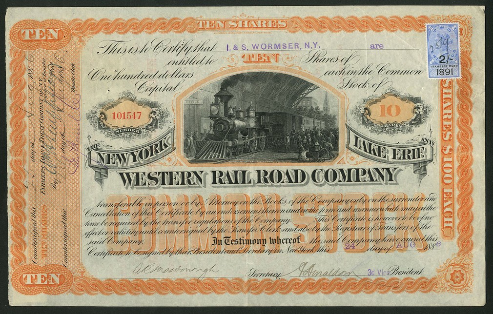 New York, Lake Erie and Western Rail Road Co., a group of 4 certificates for 10 shares of $100 each, New York 188[6], 3 examples and 188[3], steam train at busy station, ornate border, orange and black, all with English adhesive revenue stamps, NOT cancelled, generally VF or thereabouts. (4)