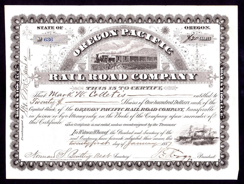 Oregon Pacific RailRoad Co. $100 shares, 188[7], #636 vignette of steam train passing over bridge at top, smaller vignette of steam ship bottom right, ornate border, black, printed by Henry Siebert & Bros., uncancelled, GVF.