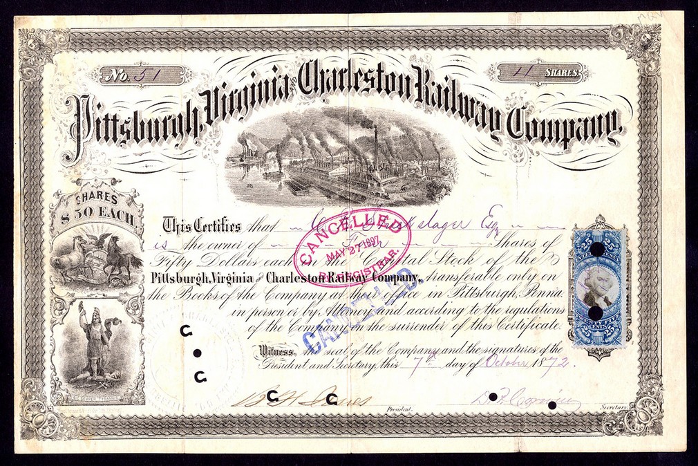 Pittsburgh, Virginia and Charleston Railway Co. $50 shares, 18[72], #51, signed as President by Benjamin Franklin Jones, vignette of steam train passing through industrial scene at top, black, hole cancelled through signatures and adhesive revenue stamp, slight glue residue at left, GVF.