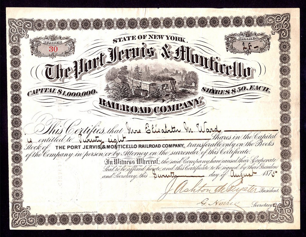 Port Jervis & Monticello RailRoad Co. (NY), $50 shares, 187[5], #30 attractive vignette of steam train passing through pastoral scene at top, ornate border, black, printed by Hamilton and Adams, uncancelled, creases to bottom edge, VF.