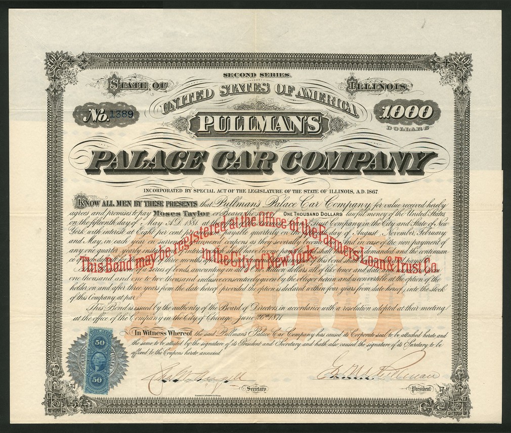 Pullman's Palace Car Co. (IL), 8% bond, second series, 1871, $1000, #1389, large format, black, orange underprint, silver seal with blue 50c revenue stamp, neatly hole cancelled, VF.