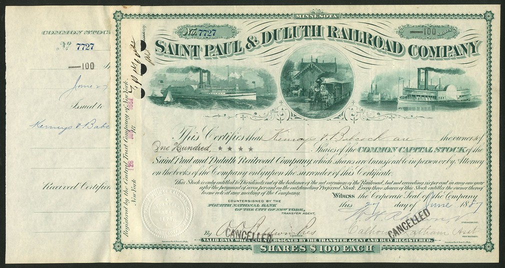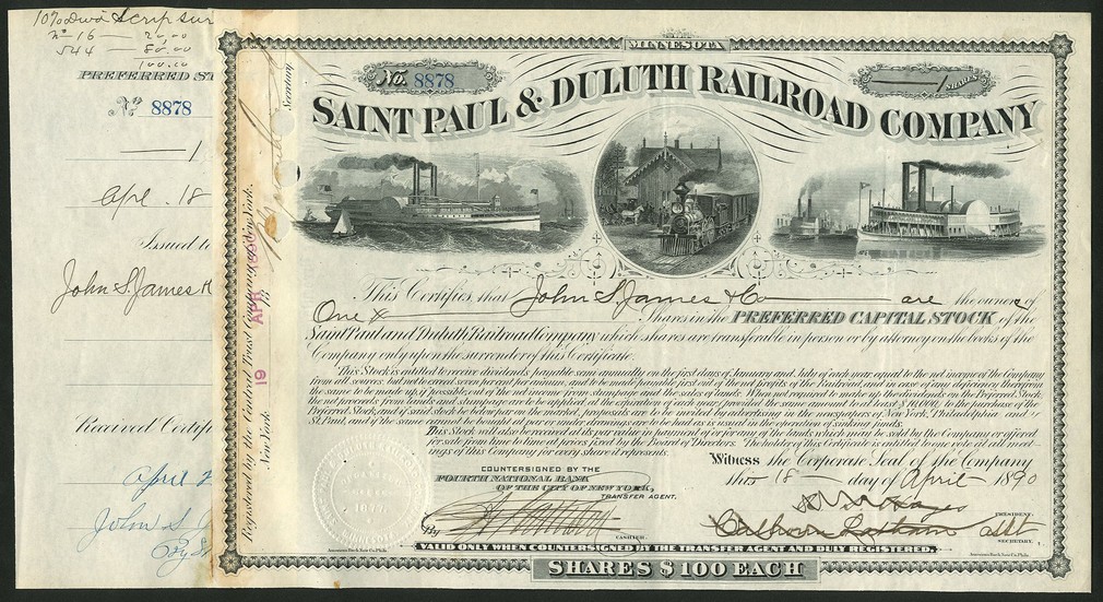 Saint Paul & Duluth Railroad Co. (MN), a group of 8 certificates for $100 common stock, 18[87] and 10 certificates for preferred stock of $100, 18[89] or [90], all with attractive vignettes of steam train, ocean going paddle steamer to the left and river paddle steamer to the right, green and black respectively, all reglued to their counterfoils, neatly hole and stamp cancelled, VF to EF (18)