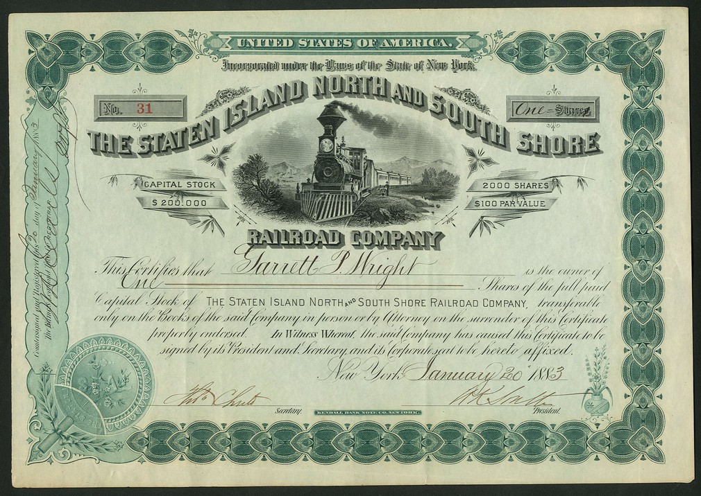 Staten Island North & South Shore Railroad Co. (NY), $100 shares, New York 188[3], #31, steam train in centre, green and black, GVF.