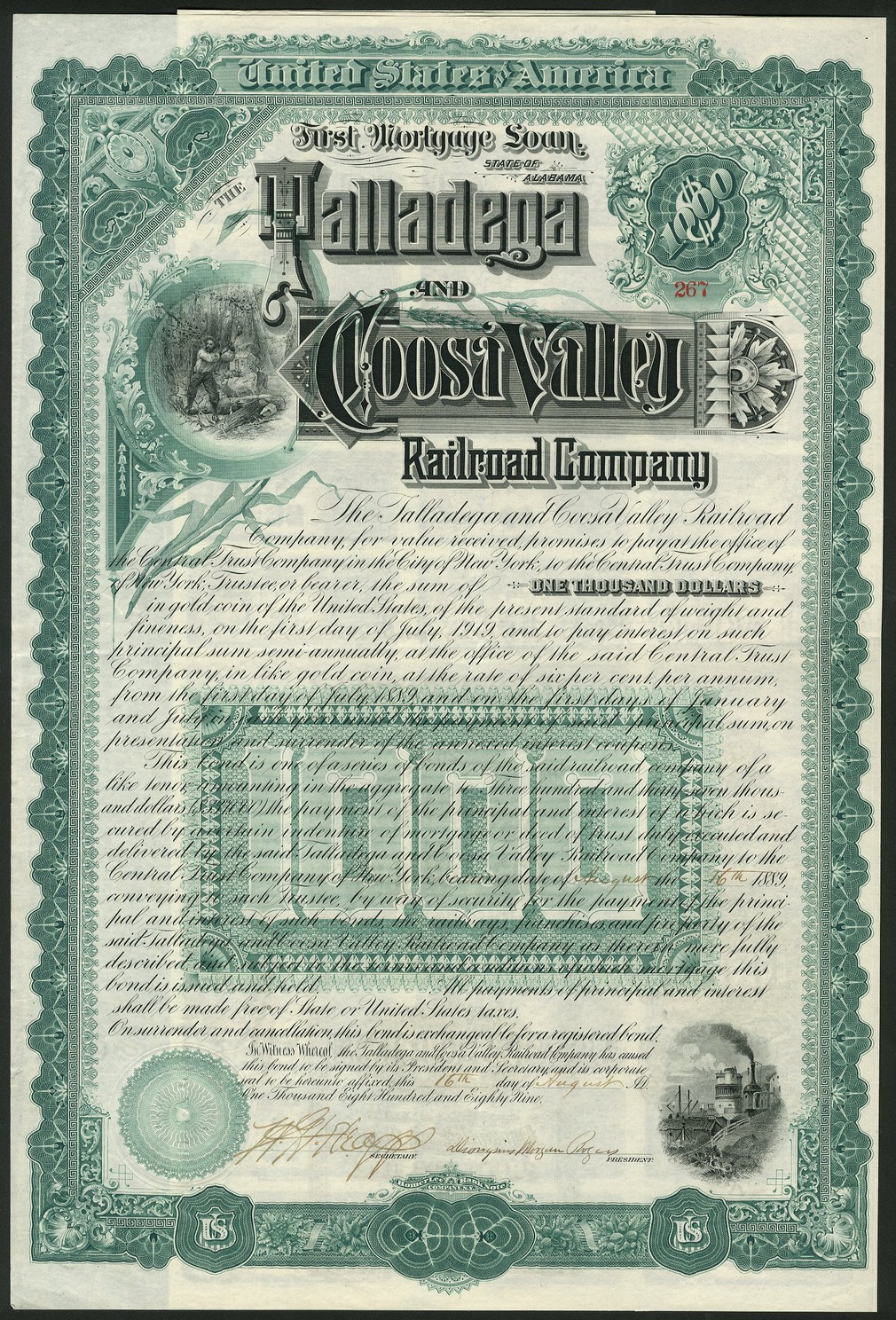 Talladega and Coosa Valley Railroad Co. (AL), First Mortgage bond for $1000, 1889, #267, attractive piece withvignettes of man felling trees and engine house, green and black, with coupons, AEF