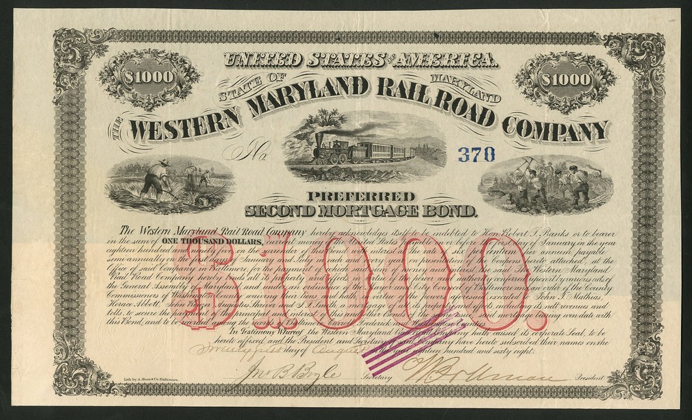 Western Maryland Railroad Co. (MD), Preferred Second Mortgage Bond, $1000, 1868, #370, steam train in centre, farmers at left and railroad workers at right, black, red '$1000' in underprint, with coupons, neat cancellation, GVF