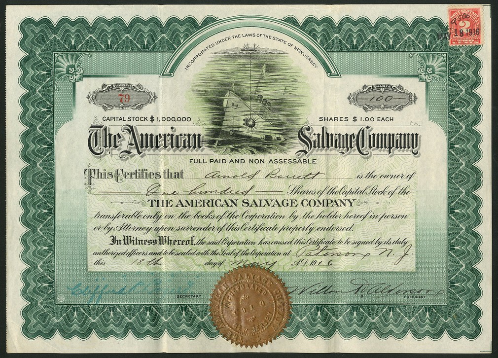 American Salvage Company (NJ), a group of 8 certificates for $1 shares, 19[16], #79 to 84 and #1160 and 1161, lovely vignette of sunken ship with salvage vessel, green and black, gold seal, GVF+. (8)