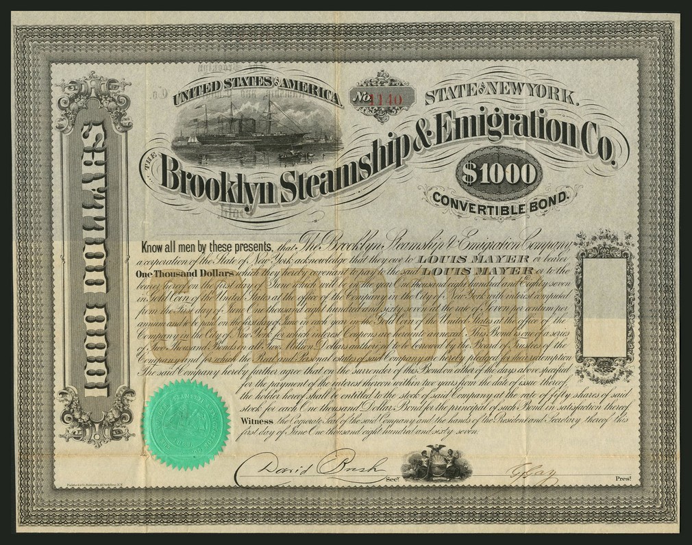 Brooklyn Steamship & Emigration Co., (NY), $1000 Convertible Bond, 1867, #1140, paddlesteamer at top left, black with gold underprint and green paper seal, with coupons, together with South Brooklyn Saw Mill Company, $100 shares, 18[92], #390, sawmill top centre, green, the last a little toned at top, VF. (2)