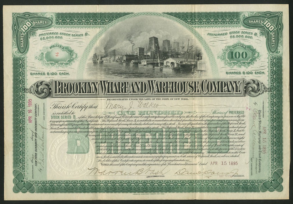 Brooklyn Wharf and Warehouse Co. (NY), 100 shares preferred stock 'B', [1895], #2, lovely vignette of dockside and warehouses, green and black, printed by ABNCo., GVF.