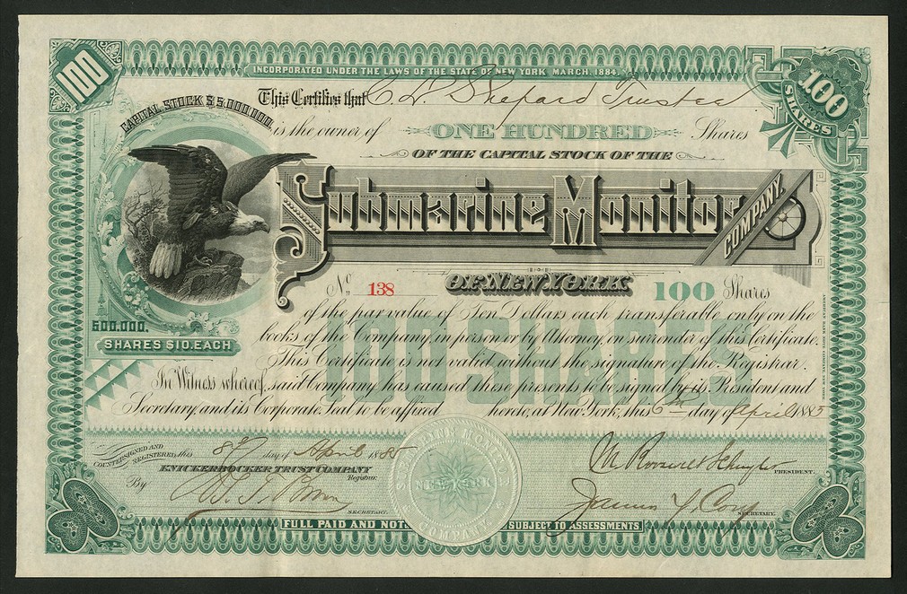 Submarine Monitor Company of New York, $10 shares, New York 188[5], #138, signed by Montgomery Roosevelt Schuyler as President, bald eagle at left, ornate printing, green and black, near EF.