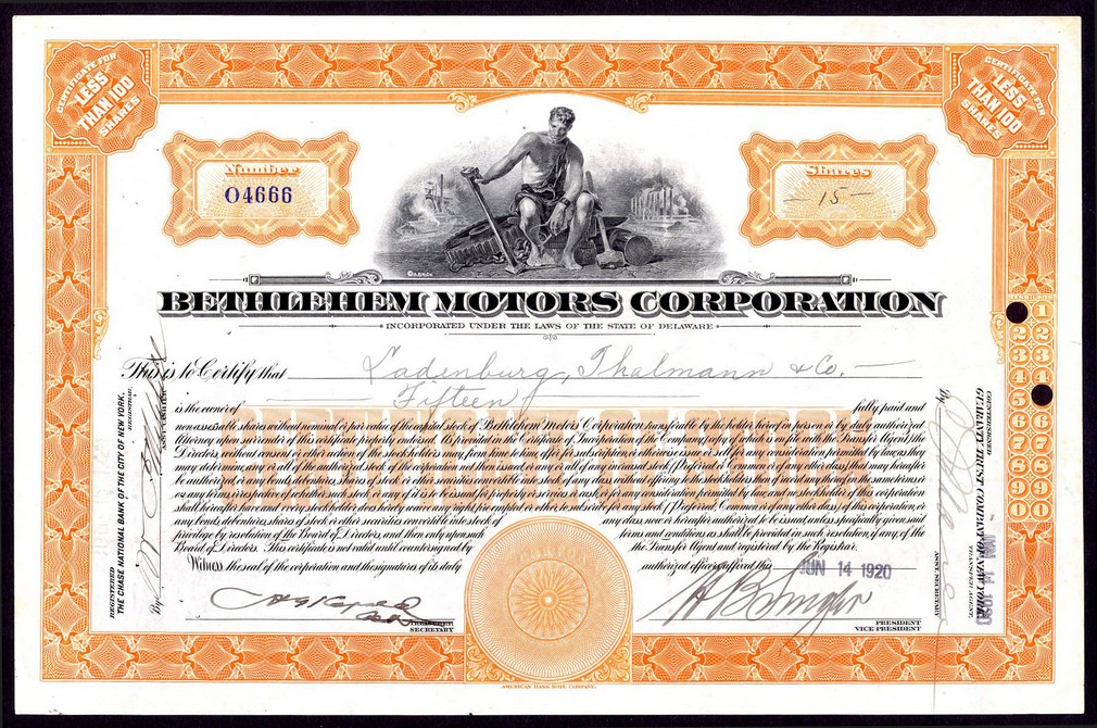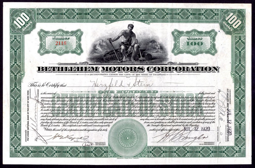 Bethlehem Motors Corporation, (DE), a pair of certificates, for less than 100 shares, #04666 and 100 shares, [1920], #2116, ornate border, vignette at top depicting allegorical figure with tools and factory in background, printed by American Bank Note Company, orange and green respectively, EF & GVF. (2)