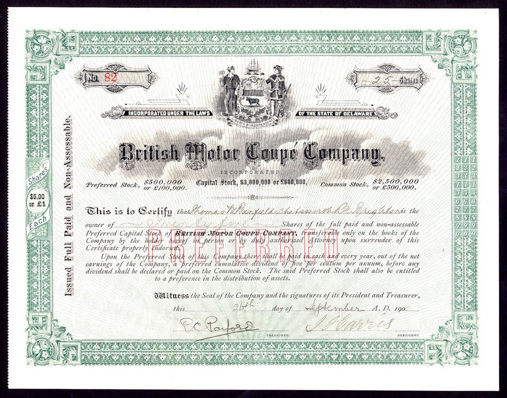 British Motor Coupé Company, (DE), certificate for $5 preference shares, 190[0], #82, ornate border, vignette at top of the Great Seal of the state of Delaware, black and green, EF.