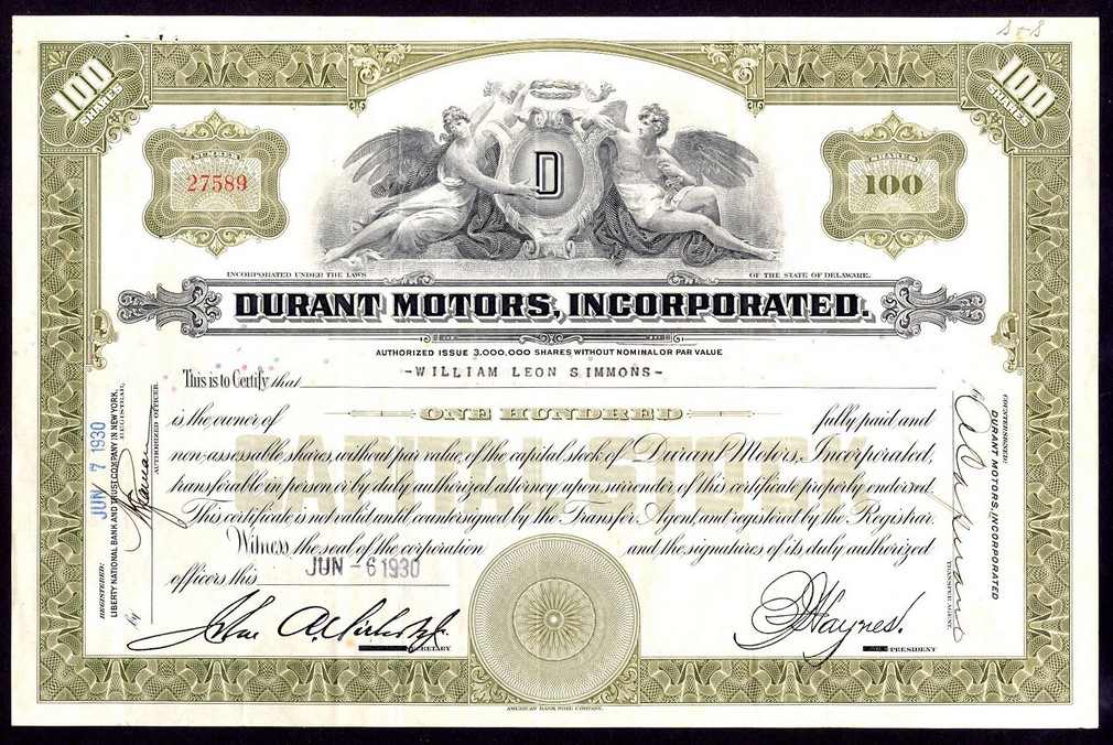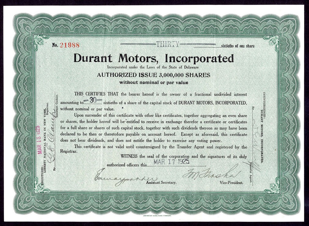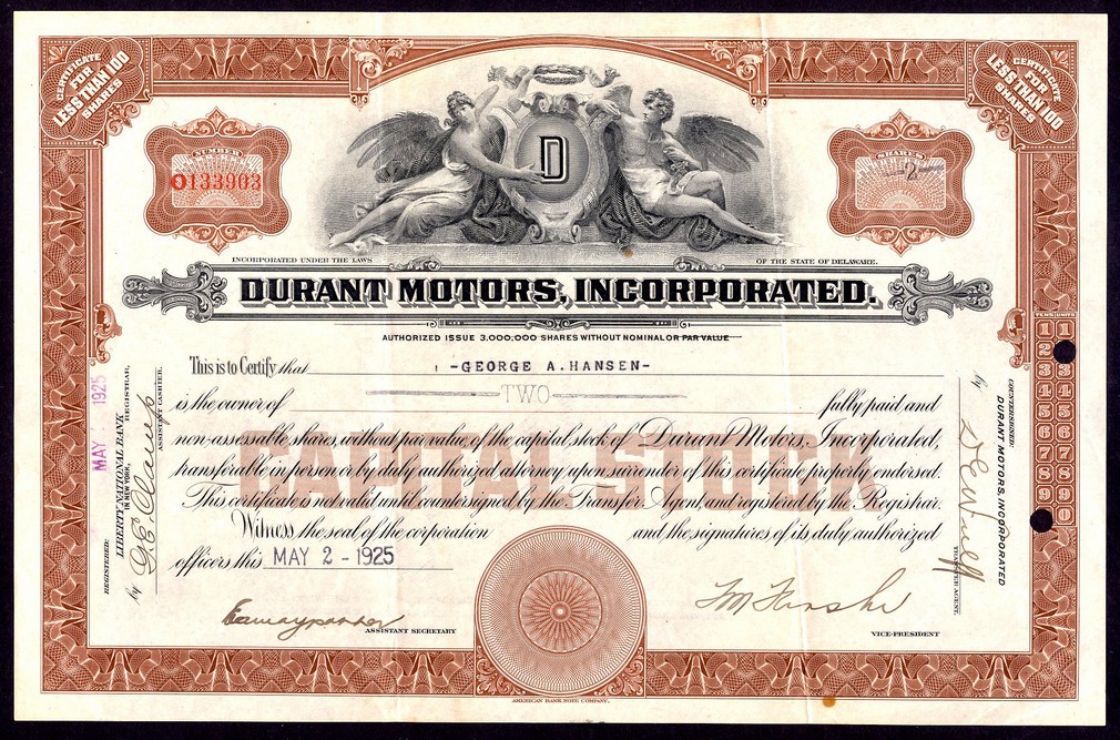 Durant Motors, Incorporated, (DE), a trio of certificates comprising; 100 capital stock shares, [1930], #27589, ornate border, vignette at top of winged figures beside shield, green and black; sixtieths of one share, [1925], #21988, ornate border, green with green underprint; less than 100 shares, [1925], #O133903, ornate border, vignette at top of winged figures beside shield, brown and black, all printed by American Bank Note Company, generally better than very fine. (3)
