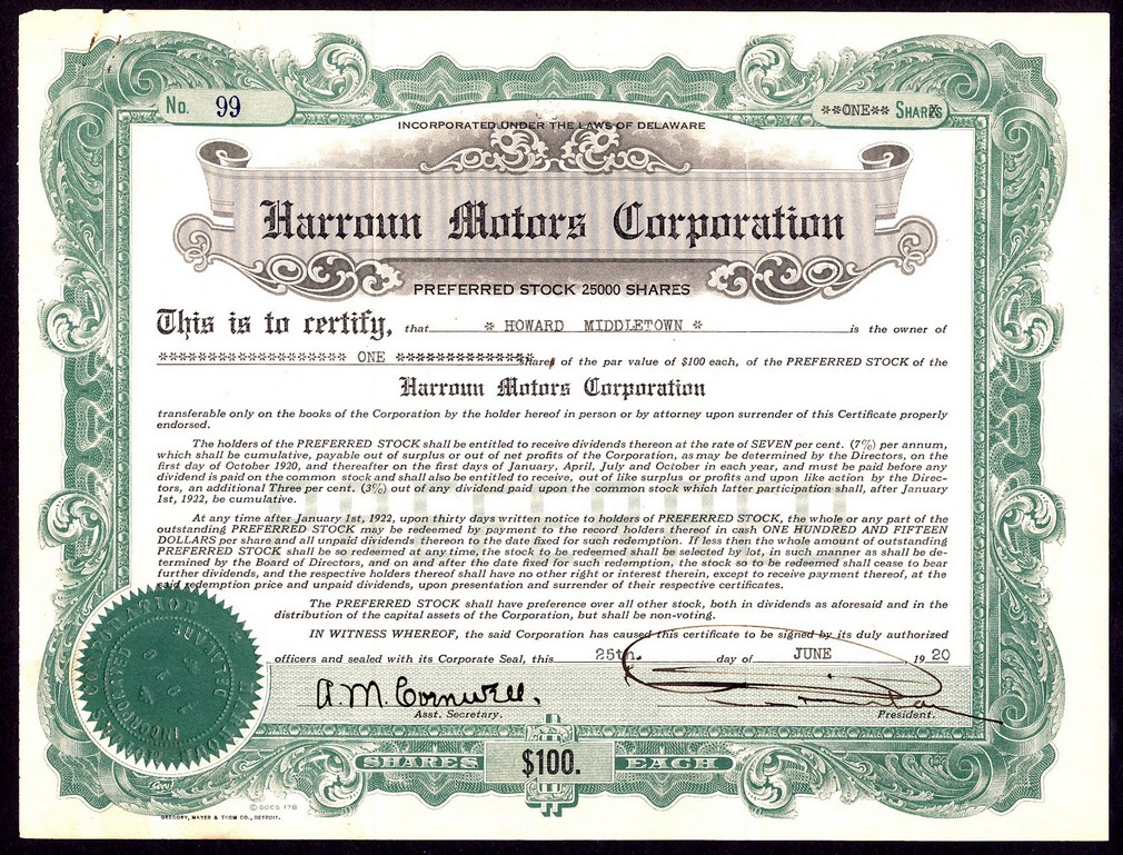 Harroun Motors Corporation, (DE), certificate for $100 preference shares, 19[20], #99, ornate border with scrollwork, green and black, green seal, printed by Gregory, Mayer & Thom Co, better than VF.
