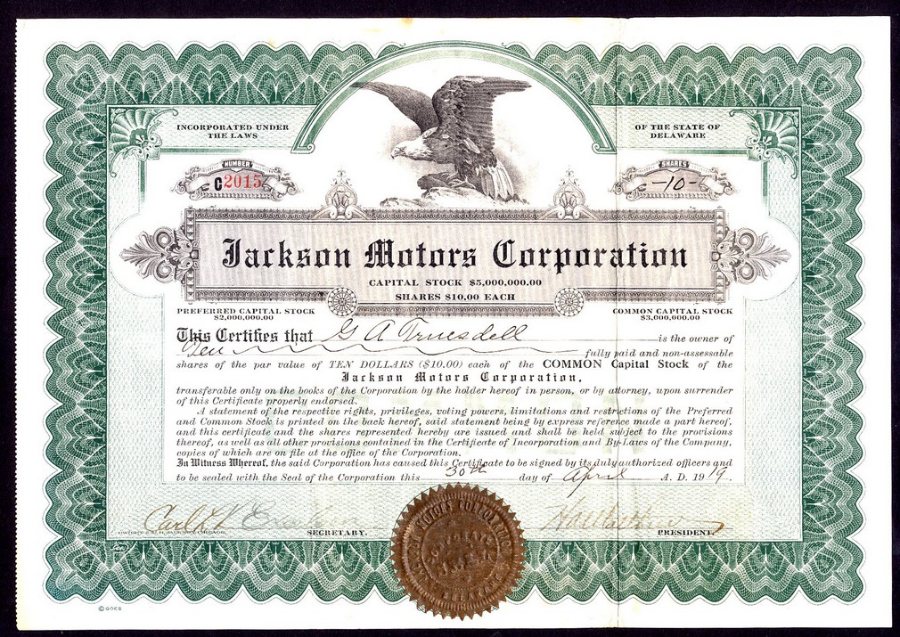 Jackson Motors Corporation, (DE), certificate for $10 shares, 19[19], #C2015, ornate border, American Eagle at top, green and black, gold seal, printed by Dwight & M.H. Jackson, VF.