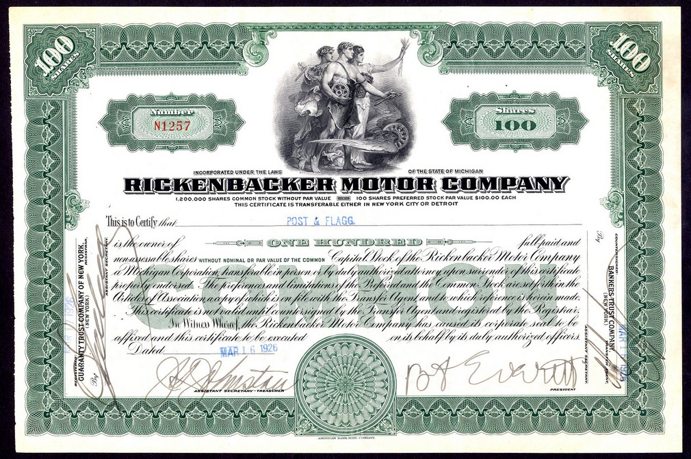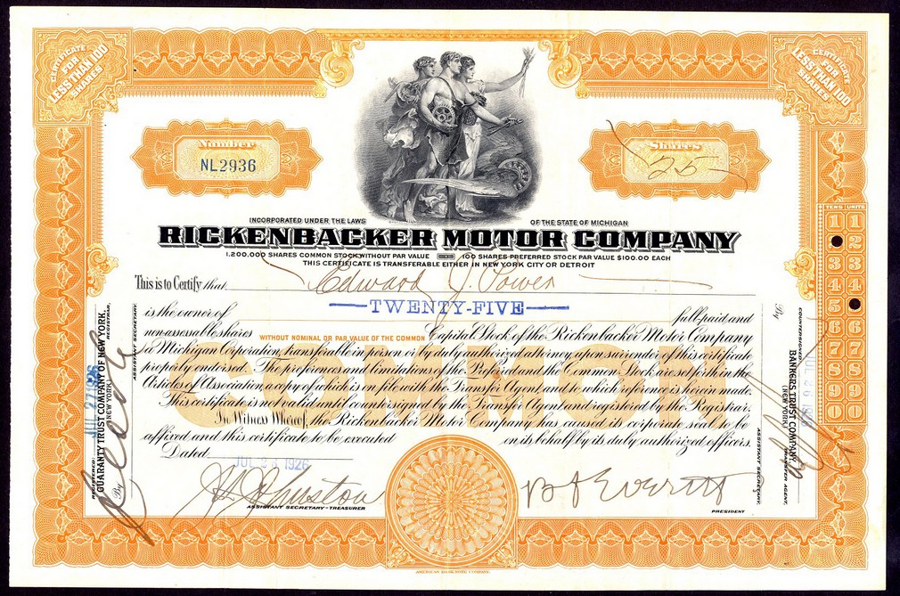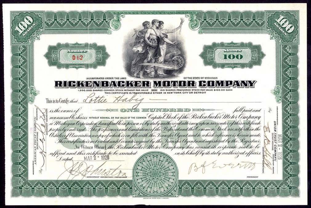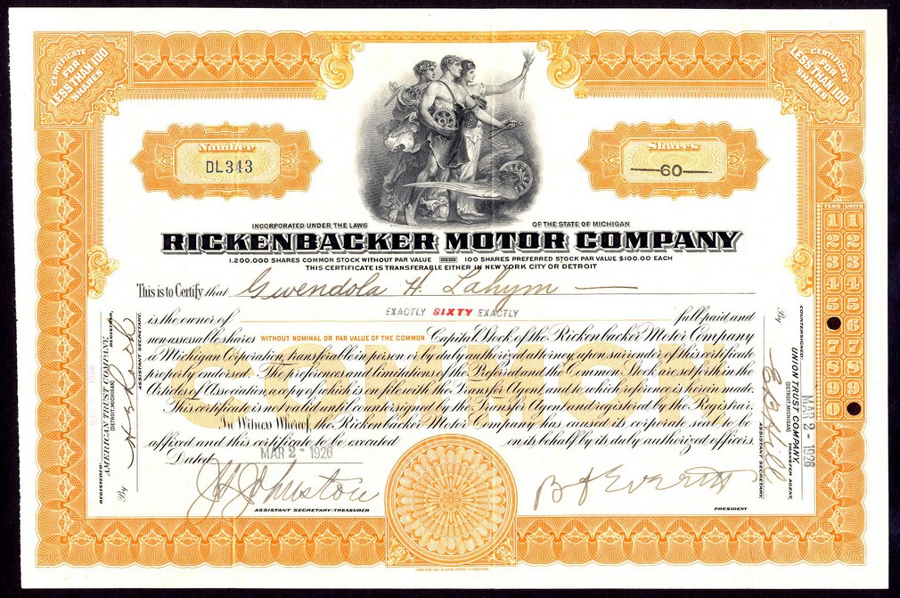 Rickenbacker Motor Company (MI), a group of 4 certificates, two for 'less than 100 shares', [1926], #NL2936 and #DL343, ornate border, allegorical figures at top, orange, together with two certificates for 100 shares, [1926], #D62 and #N1257, ornate border, allegorical figures at top, green, printed by American Bank Note Company, number prefixes represent either New York or Detroit transfer offices EF. (4)