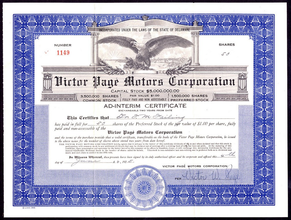 Victor Pagé Motors Corporation (DE), certificate for $1 shares, 192[5], #1149, ornate border, American Eagle at top, blue and black, EF.
