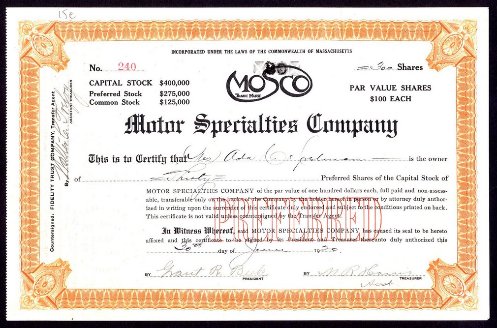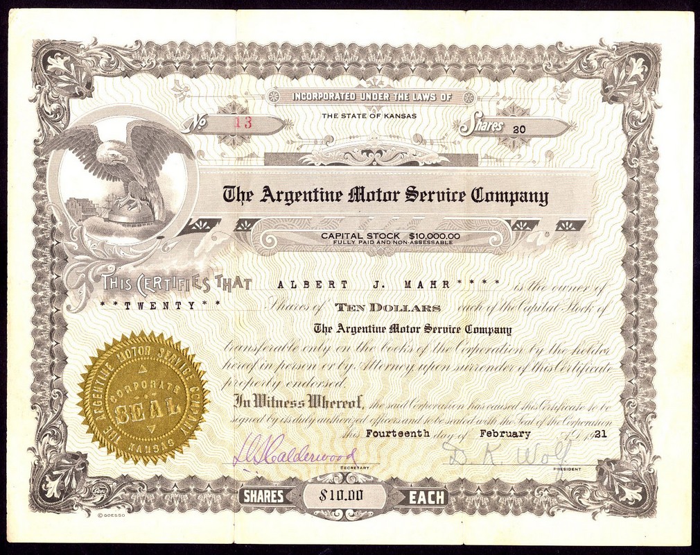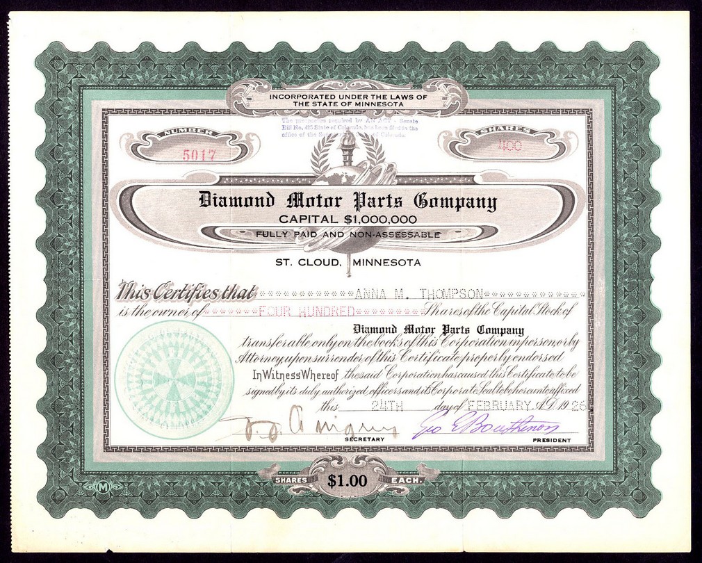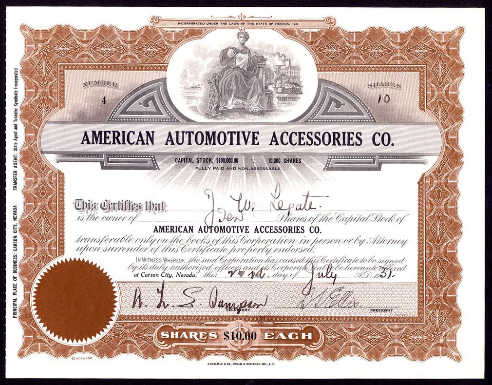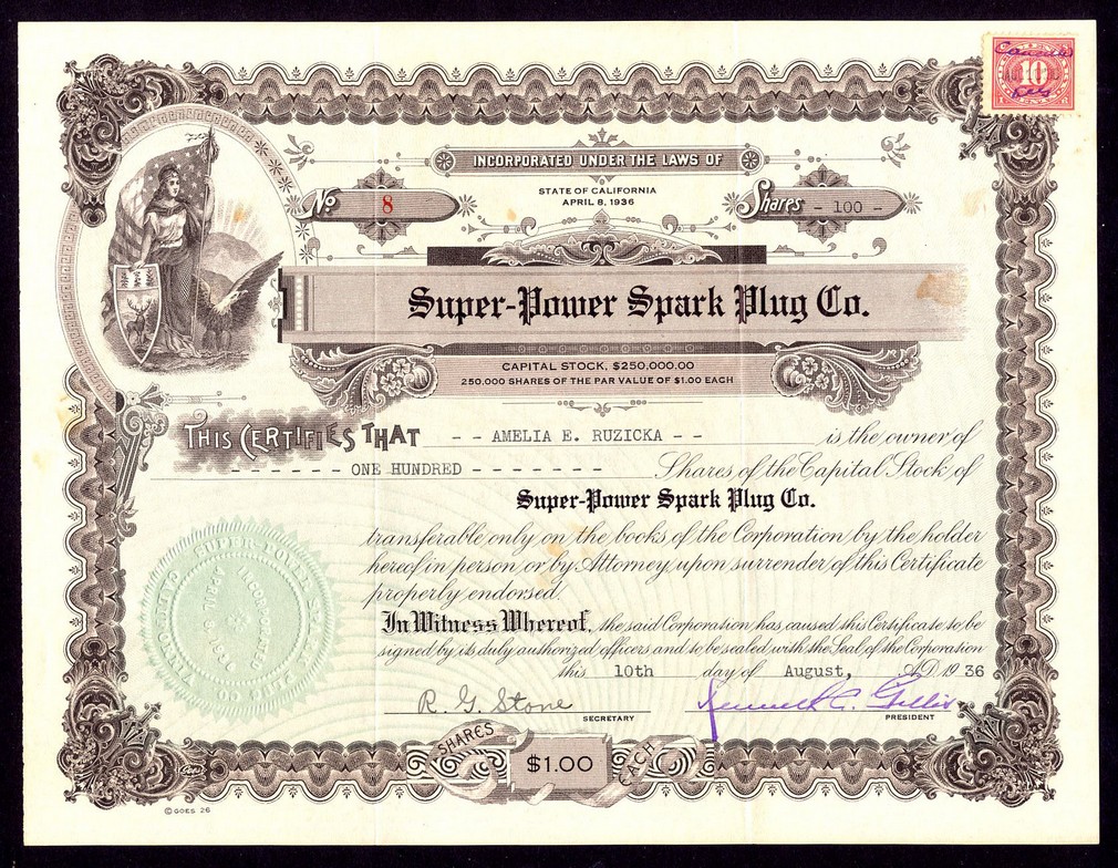 A collection of Motor Accessory Company certificates (10) comprising; The Argentine Motor Service Company, $10 shares, 19[21], no.13; American Automotive Accessories Co., $10 shares, Carson City 19[31], no.4; Diamond Motor Parts Company, two certificates for $1 shares, 19[26] and 19[27], no.5017 and no.12247; Tire Mileage Recording Device Company, $1 shares, 19[10], no.5; Motor Specialties Company, two certificates for $100 shares and $10 shares, 19[20], no.240 and no.352; Perfecto Gear Differential Co., $25 shares, 19[20], no.422; Super-Power Spark Plug Co., $1 shares, 19[36], no.8; Victor Motor & Clutch Company, $1 shares, 19[19], no.624, generally VF and better. (10)
