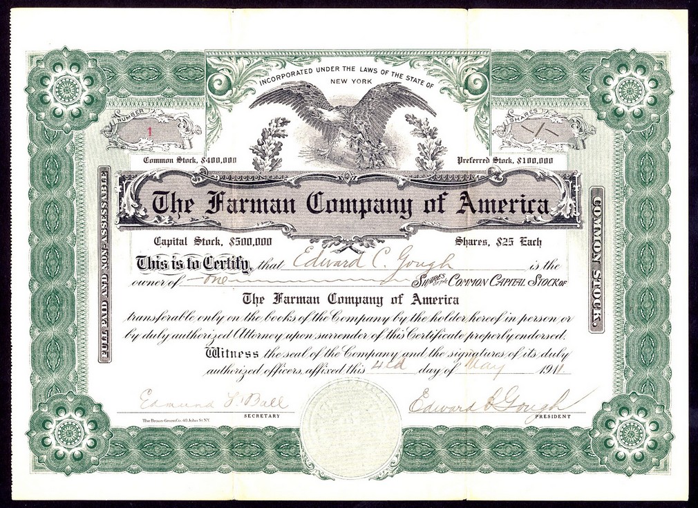 Farman Company of America (NY), certificate for $25 shares, 191[1], #1, ornate border, American Eagle above title, green and black, printed by The Broun-Green Co., EF.