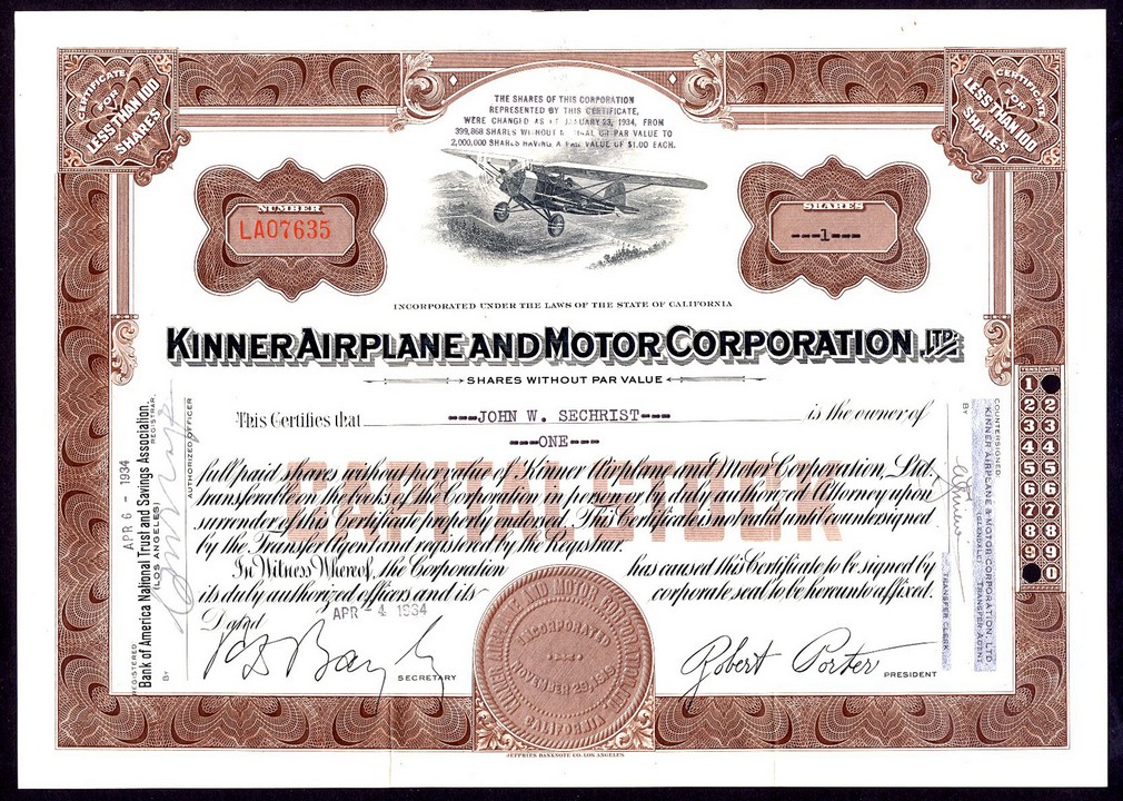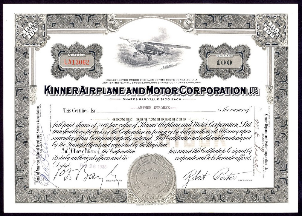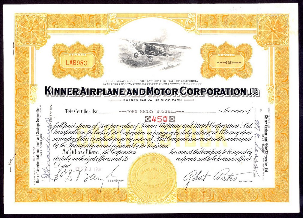 Kinner Airplane and Motor Corporation Ltd (CA), a trio of certificates; 'less than 100 shares' of $1, [1934], #LA07635; 100 shares of $1, [1936], #LA13062; unspecified quantity of $1 shares, [1936], #LAB983, ornate border and vignette of aircraft above title, brown, black and orange respectively, printed by Jeffries Banknote Co., VF & EF. (3)