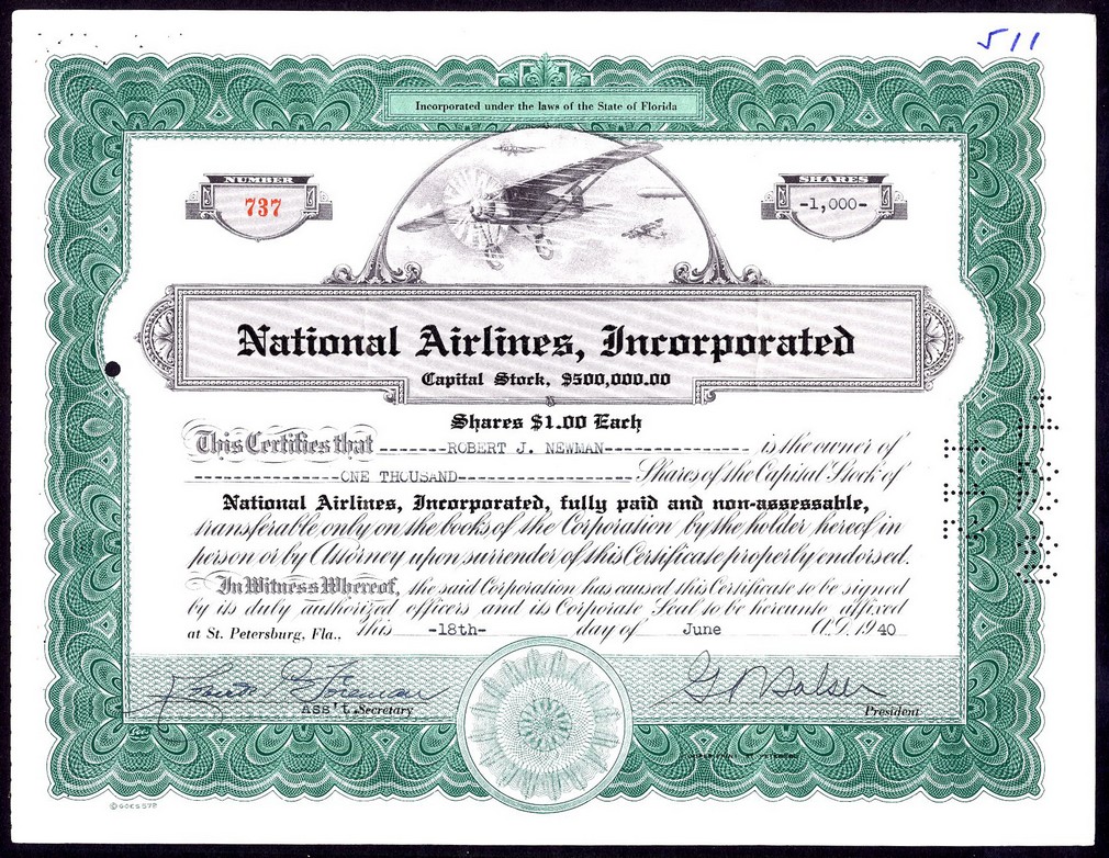 National Airlines, Incorporated (FL), certificate for $1 shares, 19[40], #737, ornate border, vignette of aricraft at top, green and black, EF.