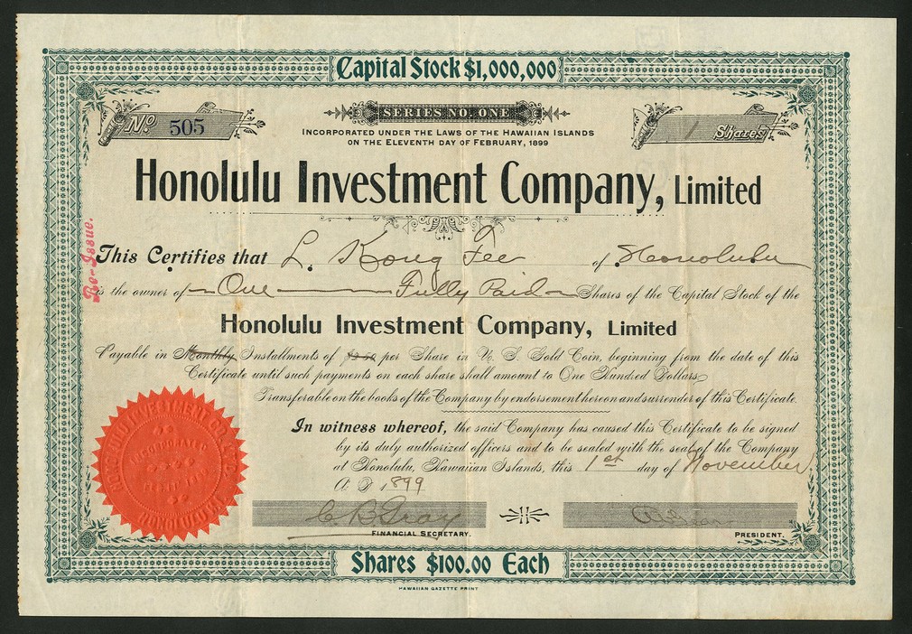 Honolulu Investment Company Ltd., $100 share, Honolulu 1[899], #505, green ornate border, red seal, brown underprint, EF and scarce.