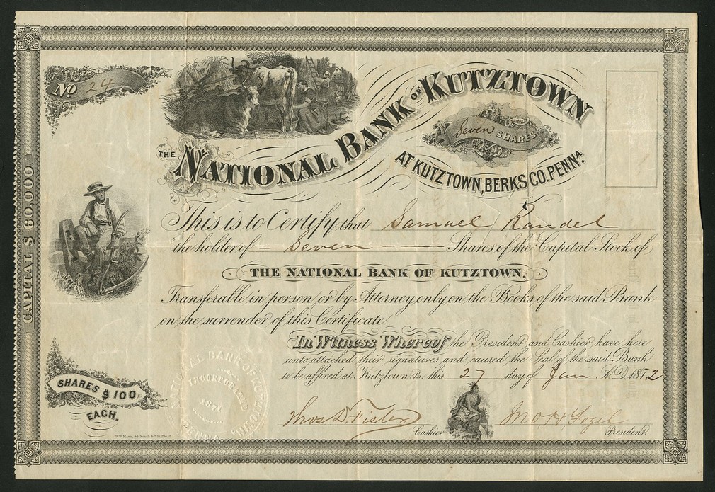 National Bank of Kutztown, $100 shares, Kutztown Pennsylvania 18[72], #24, farming vignettes top and side, black, folds and cut cancellations otherwise VF.