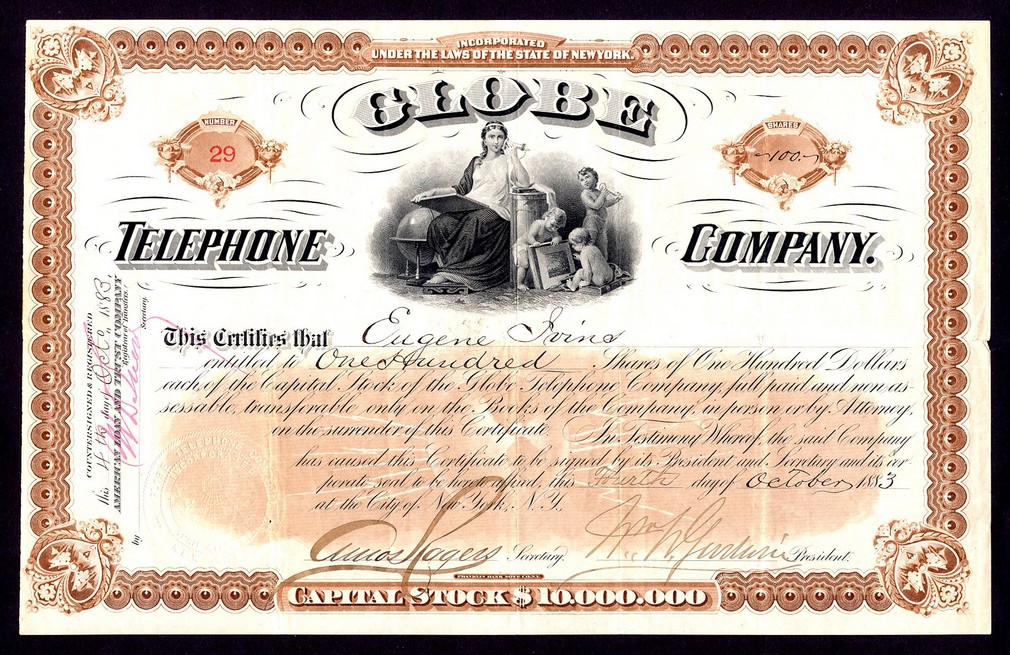 Globe Telephone Company (NY), $100 shares, 188[3], #29, allegorical female talks on telephone whilst children play at her feet, ornate border, brown and black, VF.
