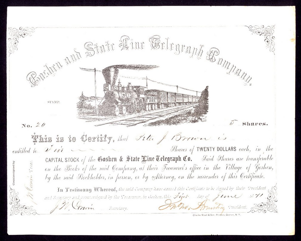 Goshen and State Line Telegraph Co., $20 shares, Goshen 18[71], #20, steam train and telegraph wires in centre, black, GVF.