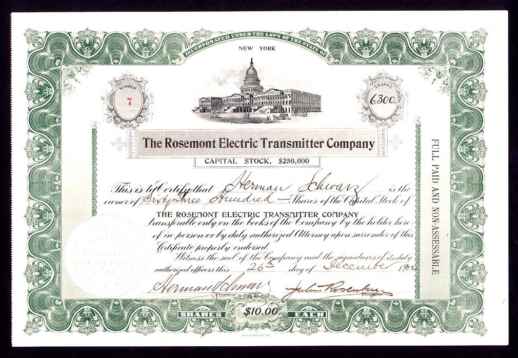 Rosemont Electric Transmitter Company, (NY), certificate for $10 shares, 19[02], no.7, ornate border, state capitol at top, green and black, printed by Adams & Grace, EF.