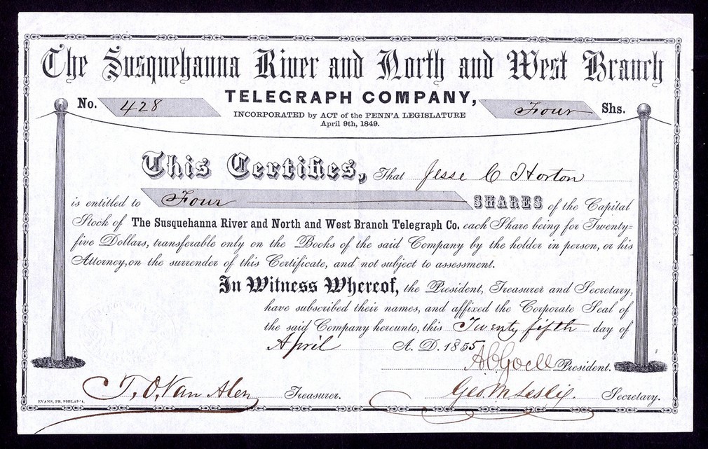 Susquehanna River and North and West Branch Telegraph Company, (PA), certificate for $25 shares, 185[5], #428, fine border, telegraph poles at sides, black on blue paper, printed by Evans,AEF.