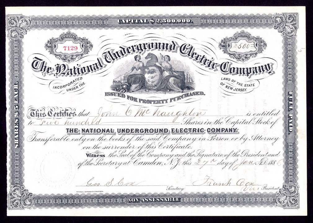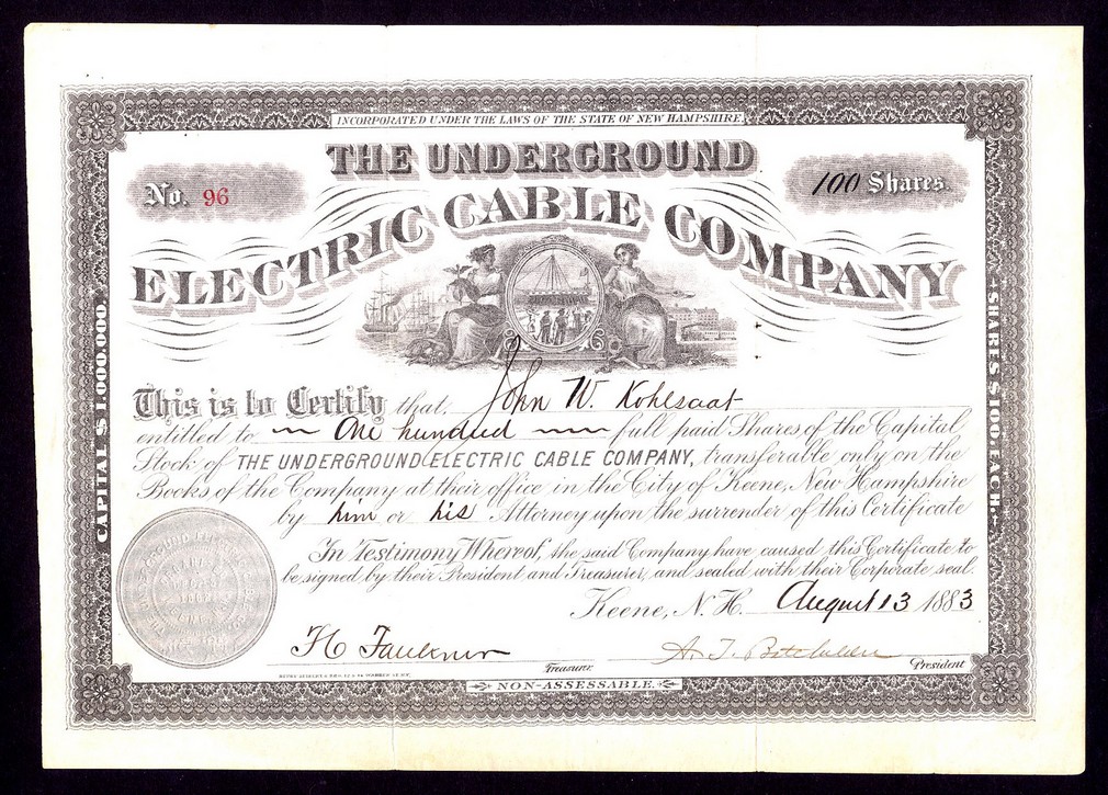 Underground Electric Cable Company, (NH), certificate for $100 shares, Keene 188[3], #96, ornate border, vignette of two allegorical figures with sailing ships and steam train, black, printed by Henry Seibert & Bro, together with The National Underground Electric Company, (NJ), certificate for $5 shares, Camden 188[6], #7129, ornate border, vignette under title depicting images from New Jersey State Flag, black, printed by William Mann, VF+. (2)