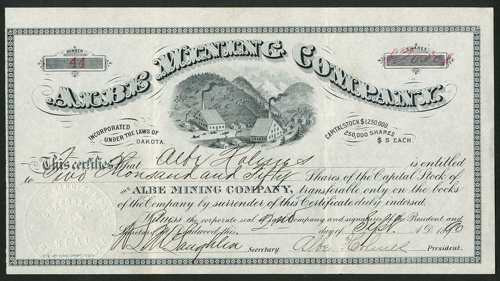 Albe Mining Co. (Dakota Territory), $5 shares, Deadwood 188[90], #44, signed by Albe Holmer as President, lovely vignette of mining camp, black, embossed seal, AEF