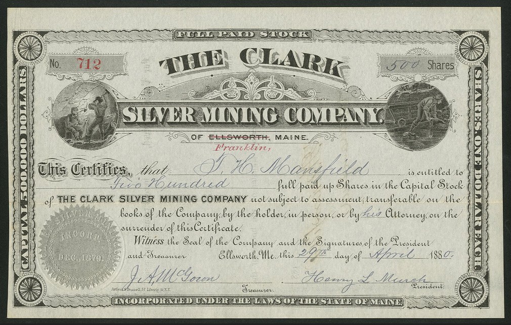 Clark Silver Mining Co. (ME), a pair of certificates for $1 shares, Ellsworth 188[0], #581 and #712, small mining vignettes either side of title, black, gery seals, VF-EF. (2)