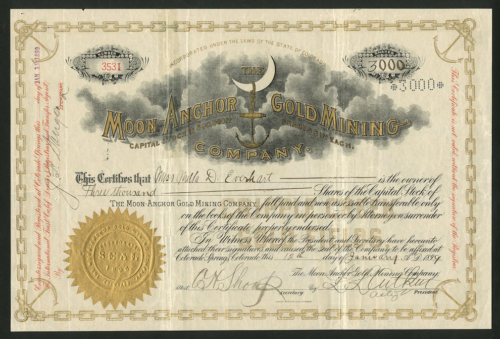 Moon Anchor Gold Mining Co. (CO), $1 shares, Colorado Springs 189[0], #3531, intertwined moon and anchor in centre, attractive design in gold and black, gold seal, F-VF