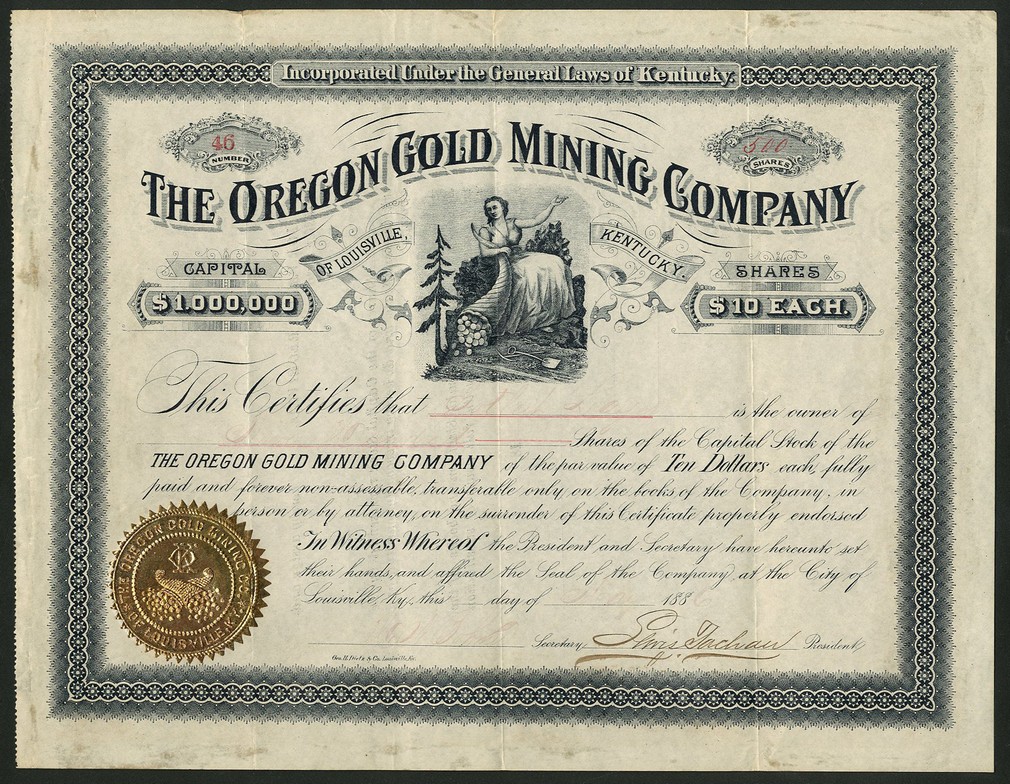Oregon Gold Mining Company (KY), $10 shares, Louisville 188[6], #46, allegorical female with cornucopia in centre, black, gold seal, some marks in margins from possible frame otherwise VF.