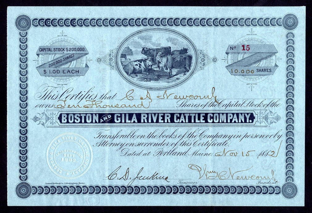 Boston and Gila River Cattle Co. (ME), certificate for [10,000] shares of $1, 188[2], #15, issued to C.A.Newcomb and signed by Wm C. Newcomb as President, cattle in centre, black on blue paper, AEF and scarce.
