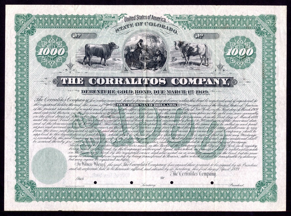 Corralitos Company (CO), unissued 8% gold bond, $1000, 1889, horses and rider at drinking trough flanked by cattle, green and black, hole cancelled, GVF.
