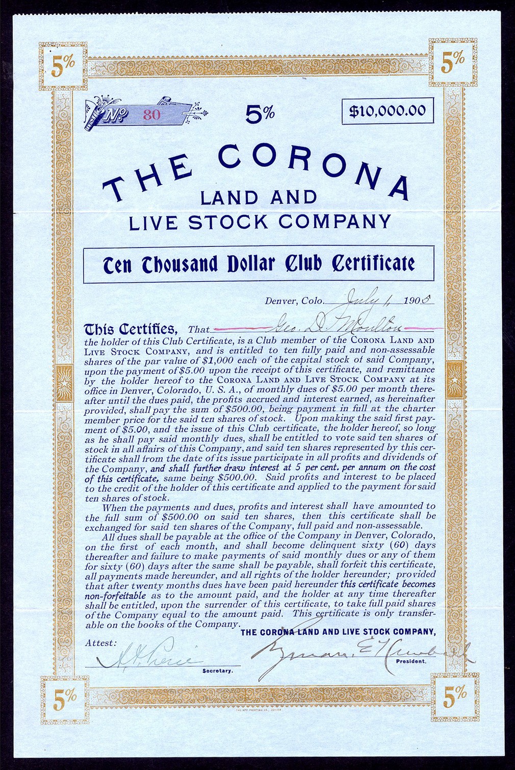 Corona Land and Live Stock Co. (CO), certificate for 10 shares of $1000 each, 190[5], #80, ornate border, gold and black on pale blue paper, VF.