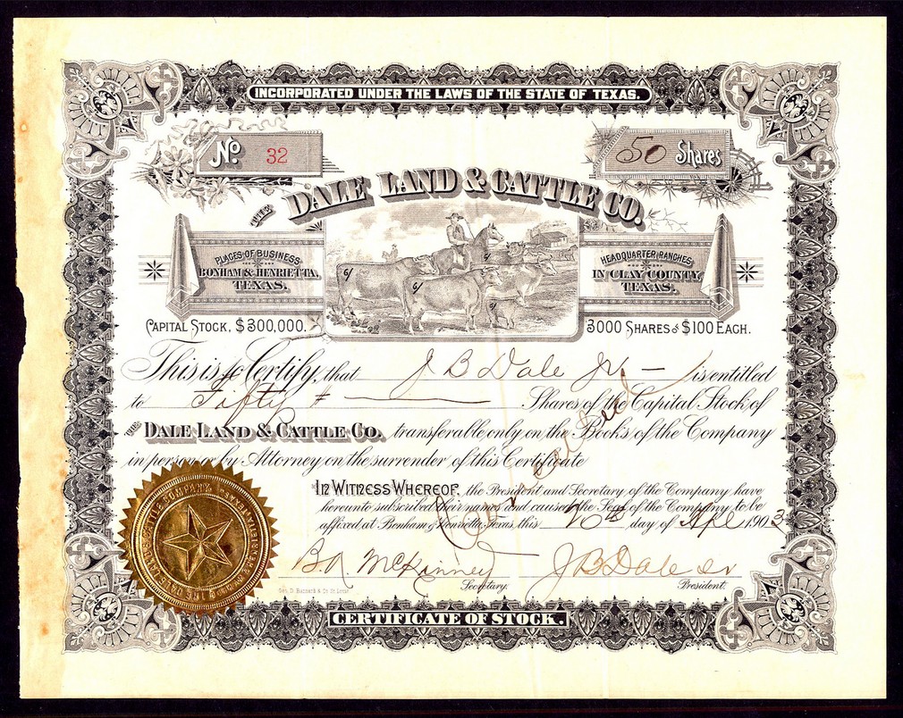Dale Land & Cattle Co. (TX), $100 shares, Bonham & Henrietta, Texas 190[3], #32, issued o and signed by J.B.Dale as president, cattle with cowboys at top, black with gold seal depicting Texas star, ink cancelled, glue reside at extreme left edge, VF.
