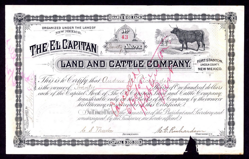 El Capitan Land & Cattle Co., Lincoln County, New Mexico, pair of certificates; $100 shares, undated but circa 1885, #43 and $1000 bond, 1885, #31, both with vignette of steer at top, black, the first cancelled across face with small piece removed from bottom margin, the second uncancelled, VF. (2)