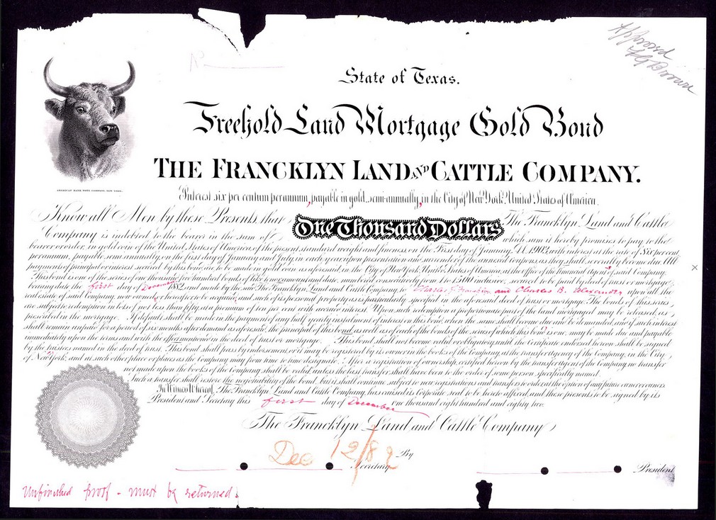 Francklyn Land & Cattle Co. (TX), a proof Freehold Land Mortgage gold bond for $1000, 1882, from the American bank Note Co archives, head of steer at top left, black, with coupons and other documentation, top edge with a little damageD, hole cancelled and annotated, VF.