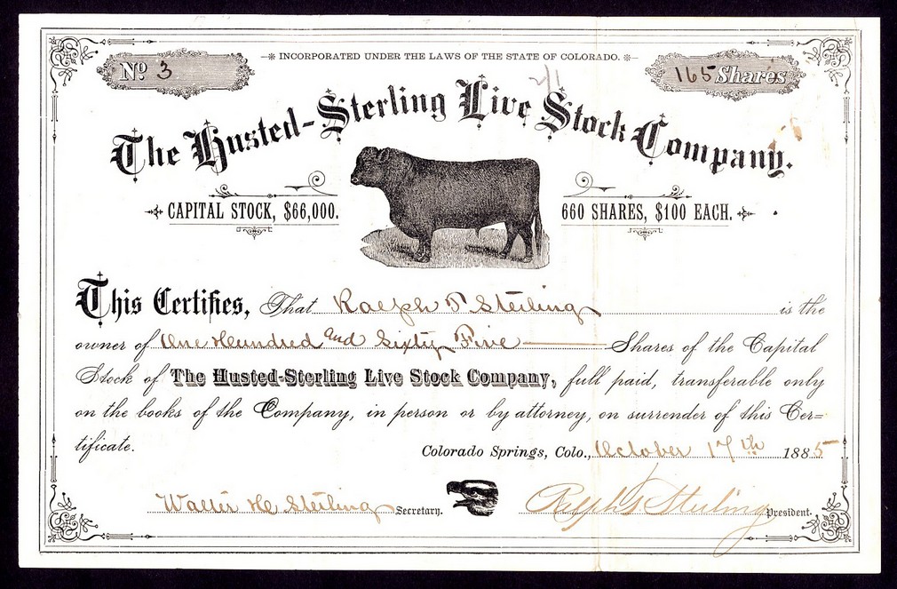 Husted-Sterling Live Stock Company (CO), $100 shares, Colorado Springs 188[5], #3, issued to Ralph Sterling and signed by him as President, bull in centre, black, VF.