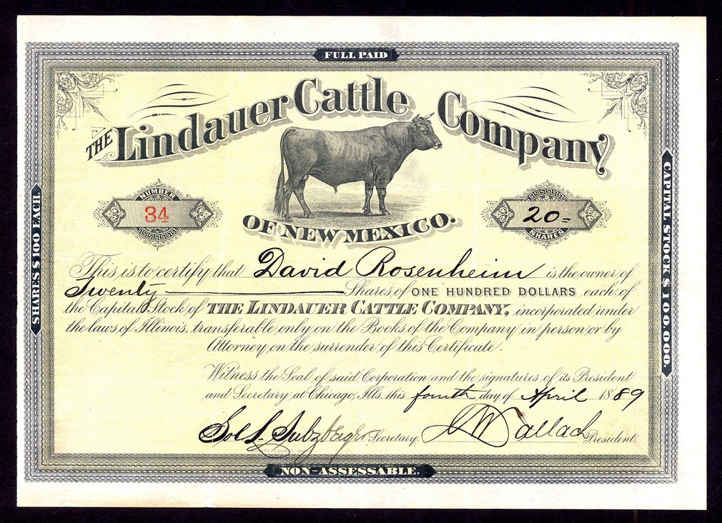 Lindauer Cattle Co. of New Mexico, $100 shares, Chicago 18[89], #34, bull in centre, ornate border, black with yellow underprint, VF.