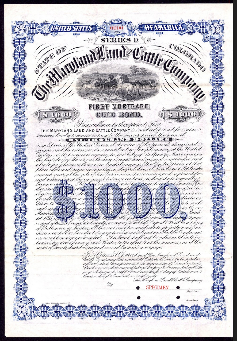 Maryland Land & Cattle Co. (CO), a specimen first mortgage gold bond for $1000, 1886, horses at play, ornate border, blue and black, with coupons, printed by Homewr Lee Bank Note Co. numbered 0000, VF and scarce