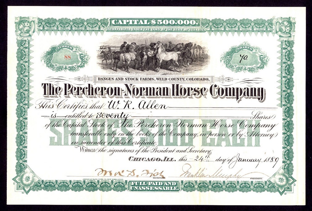Percheron-Norman Horse Co. (IL), $100 shares, Chicago 18[89], #88, horses and traders at top, ornate border, green and black, with related letter from the company, VF.