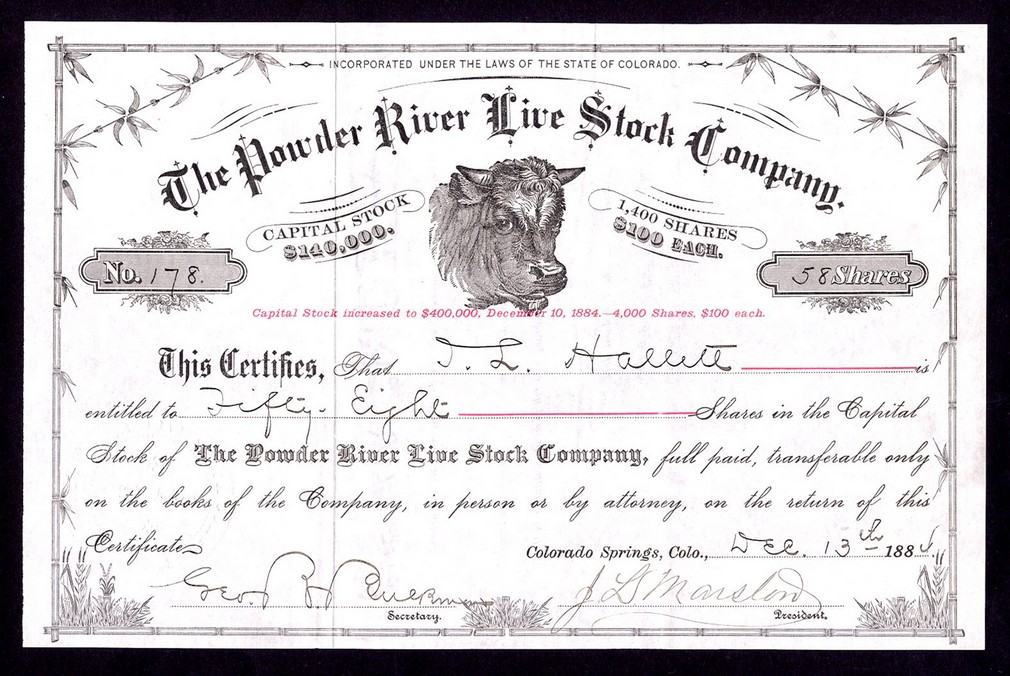 Powder River Live Stock Co. (CO), $100 shares, Colorado Springs 188[4], #178, bulls head in centre, black, embossed seal, red overprint of capital to $400,000, GVF.