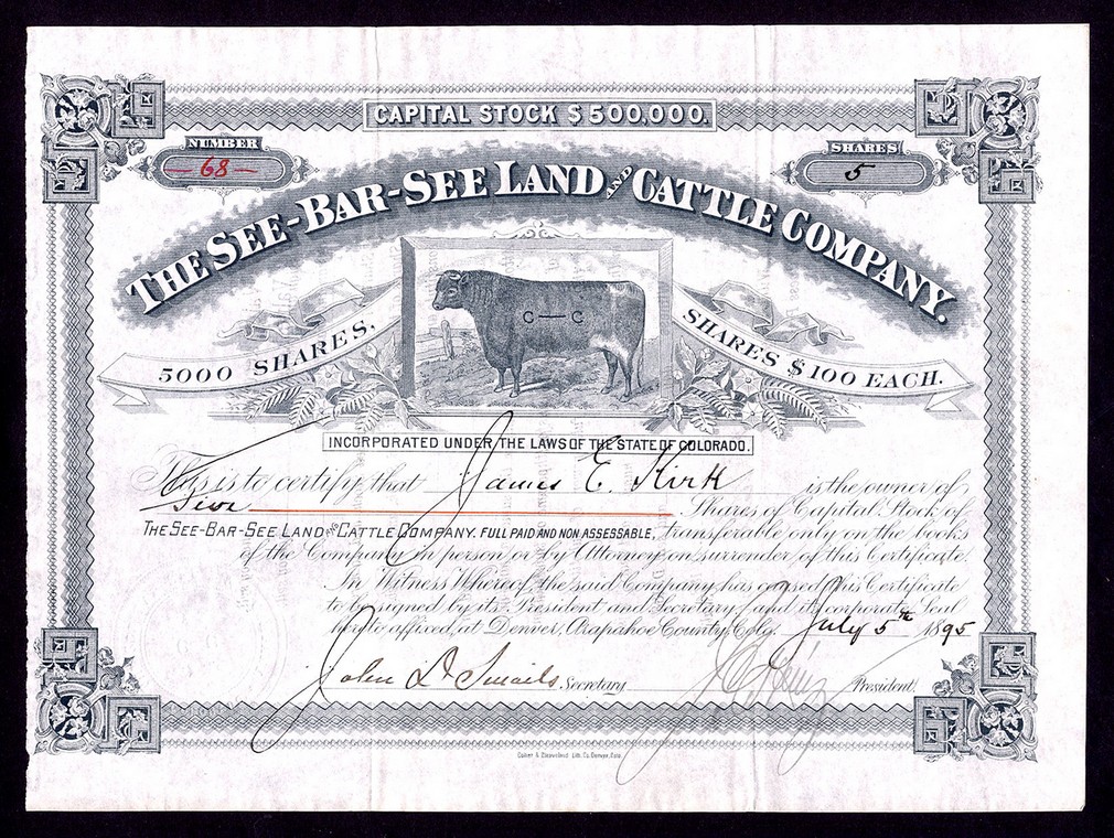 See-Bar-See Land & Cattle Co. (CO), $100 shares, Denver 18[95], #68, bull in centre with C-C brand, ornate border, black, very fine and rare