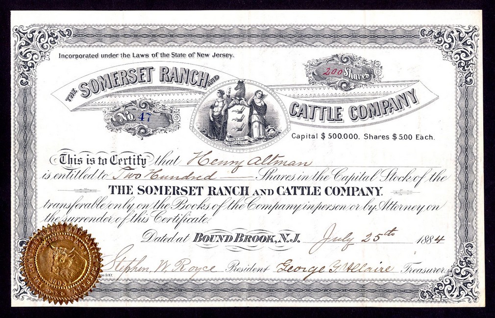 Somerset Ranch and Cattle Co. (NJ), $5 shares, Bound Brook, NJ 188[4], #47, State arms in centre, ornate border, black with gold seal depicting bull's head, VF.